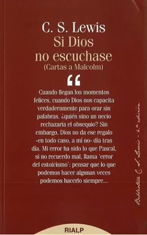 La oración es un puro don, un gran regalo de Dios. Así la entiende también Lewis. Con su habitual brillantez, el autor se sirve de la correspondencia que mantiene con otro intelectual, para aportar luz sobre cuestiones como: ¿qué valor tiene la oración?, ¿es la oración un soliloquio que nadie escucha?, ¿tiene sentido rezar por los difuntos? o ¿por qué es importante la liturgia? En sus argumentos, Lewis muestra una vigorosa convicción y, a la vez, una gran sensibilidad y comprensión para las debilidades y los miedos del hombre. C. S. Lewis nació en Irlanda en 1898, se educó en el Malvern College durante un año, y luego privadamente. Fue Tutor en el Magdalen College y profesor de Literatura en Cambrigde. Ateo en su juventud, describió su conversión al cristianismo como una experiencia que transformó su vida y su obra. Dotado de una inteligencia excepcional y de un ingenio certero y lúcido, ejerció una gran influencia tanto en sus alumnos como en sus lectores. Cultivó con igual maestría el ensayo, la novela y la literatura infantil. Mientras no tengamos rostro, El problema del dolor, Mero cristianismo, Lo eterno sin disimulo, El gran divorcio, Dios en el banquillo, son algunas de sus obras más célebres.